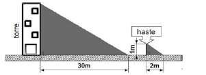 Um aluno da Escola de Especialistas de Aeronáutica que participaria de uma instrução de rapel ficou impressionado com a altura da torre para treinamento. Para tentar estimar a altura da torre, fincou uma haste perpendicular ao solo, deixando-a com 1 m de altura. Observou que a sombra da haste tinha 2 m e a sombra da torre tinha 30 m. Desta forma, estimou que a altura da torre, em metros, seria de: