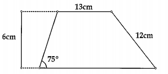 A figura acima representa o trapézio escaleno de altura 6cm, com base menor medindo 13cm, um dos ângulos internos da base maior medindo 75' e lado transversal oposto a esse ângulo igual a 12cm. Qual é a área, em cm² , desse trapézio?