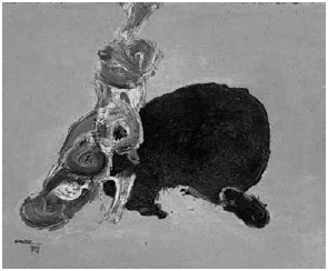 A imagem mostra a obra Composição (1967) de Manabu Mabe. Segundo Costa (2004), Manabu Mabe foi um importante pintor da abstração informal e seu estilo, de forte tendência oriental, é também chamado
