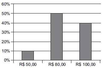 Um comerciante revende apenas três produtos, aos preços de R$ 50,00, R$ 80,00 e R$ 100,00. O gráfico apresenta, no último dia de trabalho da semana anterior, a distribuição da receita total das vendas, pelos três preços praticados.
