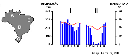Os climogramas I e II correspondem, respectivamente, às áreas assinaladas no mapa com as letras