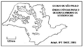 Considere o mapa e selecione a alternativa que apresenta corretamente as características das áreas mais suscetíveis a esse processo erosivo.