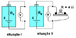 Uma bateria possui força eletromotriz ε e resistência interna R0. Para determinar essa resistência, um voltímetro foi ligado aos dois pólos da bateria, obtendo-se V_0 = ε (situação I). Em seguida, os terminais da bateria foram conectados a uma lâmpada. Nessas condições, a lâmpada tem resistência R = 4 \Omega e o voltímetro indica VA (situação II), de tal forma que V0/VA = 1,2. Dessa experiência, conclui-se que o valor de R0 é