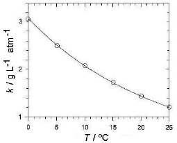 A efervescência observada, ao se abrir uma garrafa de champanhe, deve-se à rápida liberação, na forma de bolhas, do gás carbônico dissolvido no líquido. Nesse líquido, a concentração de gás carbônico é proporcional à pressão parcial desse gás, aprisionado entre o líquido e a rolha. Para um champanhe de determinada marca, a constante de proporcionalidade (k) varia com a temperatura, conforme mostrado no gráfico.