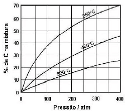 O gráfico representa a porcentagem, em mols, de C na mistura, sob várias condições de pressão e temperatura.