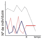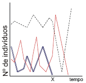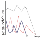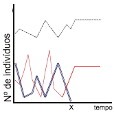 Numa determinada região, vivia uma comunidade composta por uma população de produtores, uma de consumidores primários e por outra de consumidores secundários que, dizimada por uma infecção, deixou de existir no local, a partir do tempo X. Observou-se que as outras populações foram afetadas da maneira esperada. Assinale a alternativa que corresponde ao gráfico que representa corretamente o efeito da extinção dos consumidores secundários sobre a dinâmica das outras populações.