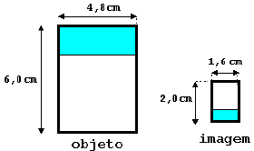A figura abaixo mostra, numa mesma escala, o desenho de um objeto retangular e sua imagem, formada a 50cm de uma lente convergente de distância focal f. O objeto e a imagem estão em planos perpendiculares ao eixo óptico da lente.