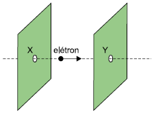 A figura representa um elétron atravessando uma região onde existe um campo elétrico. O elétron entrou nessa região pelo ponto X e saiu pelo ponto Y, em trajetória retilínea.