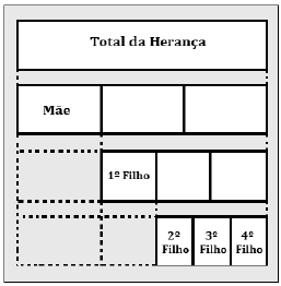 Em seu testamento, um pai deixou o diagrama mostrado a seguir, para ilustrar como deverá ocorrer a distribuição de sua herança, no valor de 2,7 milhões de reais, entre seus cinco herdeiros.