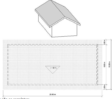 Para prever o quantitativo de telhas necessário para a execução da cobertura ilustrada nas figuras a seguir, o arquiteto está considerando, em seus cálculos, o aumento de telhas com a inclinação de 60%. O fornecedor das telhas prevê um consumo de 30 telhas para cada m², bem como o acréscimo de 10% de quebras e perdas para a execução dessa cobertura.
