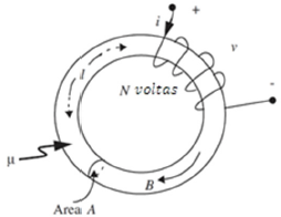 Suponha que o indutor toroidal idealizado na figura a seguir tenha as seguintes características: área de seção transversal de 1 cm2; comprimento (l), ao longo da toroidal de 10 cm; número de espiras igual a 100; \mu = 4 \pi x10^{-7} H/m. O valor da sua indutância é igual a