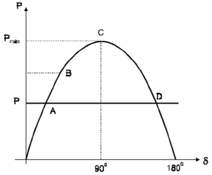 A figura a seguir ilustra a curva potência-ângulo para o sistema gerador-motor. Assinale a alternativa INCORRETA.