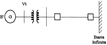 Considere o sistema máquina-barra infinita, representado pela figura a seguir. Sendo a tensão da barra infinita igual a 1,0 pu, a tensão interna do gerador igual a 1,5 pu e as reatâncias transitórias da máquina, do transformador e da linha de transmissão, respectivamente, iguais a 0,15 pu; 0,2 pu e 0,15 pu, a potência elétrica máxima será igual a