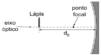 Em um experimento foi utilizado um espelho côncavo preso a um suporte, uma superfície plana e um lápis pequeno. Devido ao ajuste dos suportes, a base do lápis ficou alinhada com o eixo óptico do espelho, conforme indicado na figura. A primeira etapa do roteiro experimental consiste em colocar o lápis a uma distância do espelho d0 menor que a sua distância focal. Na segunda etapa, coloca-se o lápis a uma distância d0 igual a duas vezes a distância focal do espelho. Por fim, na terceira etapa, coloca-se o lápis a uma distância d0maior que duas vezes a distância focal do espelho.
