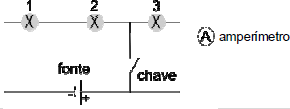 Considerando que a resistência dos fios de ligação é desprezível, assinale a alternativa que indica corretamente o esquema de ligação do amperímetro no circuito e a observação da medida da corrente elétrica com a chave ligada.