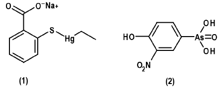 O timerosal e o roxarsone são compostos que apresentam toxicidade em sistemas biológicos, além de serem poluidores ambientais. O timerosal já foi utilizado como princípio ativo do Merthiolate e o roxarsone era empregado na engorda de frangos e porcos, mas a utilização desses compostos para essas finalidades está proibida no Brasil. As estruturas químicas do timerosal (1) e do roxarsone (2) são: