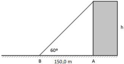 De um ponto do chão situado a 150 m de distância de um edifício, vê-se o topo do prédio sob um ângulo de 60º, como mostra a figura, desenhada sem escala.