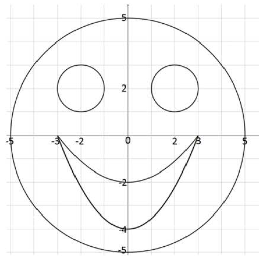 As expressões matemáticas utilizadas para desenhar o rosto, o olho direito e o lábio superior, foram, respectivamente,