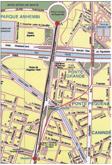 Esse é um recorte de parte da planta da cidade de São Paulo, onde foi traçado um segmento de reta \overline{AB}, com 0,11 m. A distância real entre esses dois pontos é de 1 760 m.