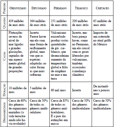 As extinções em massa que marcaram a história da Terra aconteceram em diferentes períodos geológicos.