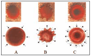 Três amostras de hemácias, A, B e C, foram isoladas do sangue de uma mesma pessoa e colocadas em soluções com diferentes concentrações de sal. A figura apresenta as hemácias vistas ao microscópio quando colocadas nas diferentes soluções. Na linha inferior, representação esquemática das células da linha superior. As setas indicam a movimentação de água através da membrana.
