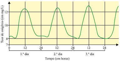 O gráfico apresenta a variação do teor de oxigênio da água de um lago ao longo de três dias.