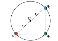 Três esferas puntiformes, eletrizadas com cargas elétricas q1 = q2 = +Q e q3 = –2Q, estão fixas e dispostas sobre uma circunferência de raio r e centro C, em uma região onde a constante eletrostática é igual a k0 , conforme representado na figura.