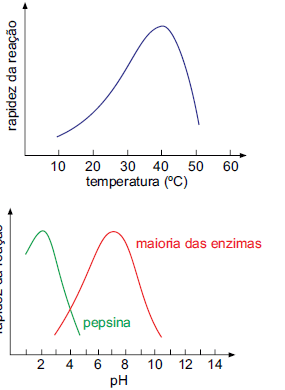 Os gráficos ilustram a atividade catalítica de enzimas em função da temperatura e do pH.