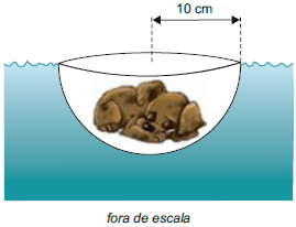 Um filhote de cachorro cochila dentro de uma semiesfera de plástico de raio 10 cm, a qual flutua em uma piscina de águas paradas, totalmente submersa e em equilíbrio, sem que a água entre nela.