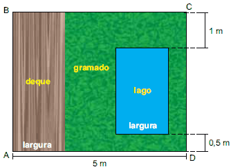 Em um terreno retangular ABCD, de 20 m2, serão construídos um deque e um lago, ambos de superfícies retangulares de mesma largura, com as medidas indicadas na figura. O projeto de construção ainda prevê o plantio de grama na área restante, que corresponde a 48% do terreno.