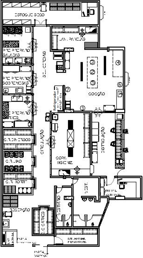 A Figura 1 apresenta o leiaute de uma Unidade de Alimentação e Nutrição - UAN. Ao nutricionista dessa UAN foi solicitada uma proposta de reforma para melhor adequação do fluxo de produção. A alternativa que permite atender a essa solicitação diz respeito às trocas de posição de: