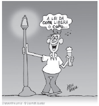 A autora do texto fala de alguns gêneros textuais, entre os quais inclui a charge. Todas as charges a seguir abordam o tema da liberação de bebida alcoólica para os jogos da Copa do Mundo. A charge que apresenta uma visão do problema diferente das demais é: