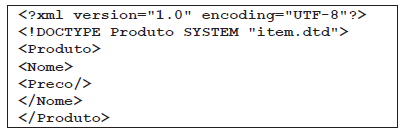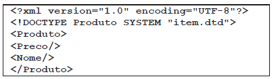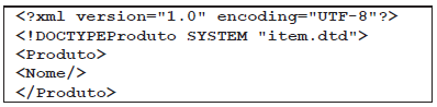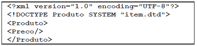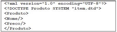 Observe o DTD abaixo armazenado no arquivo “item.dtd”