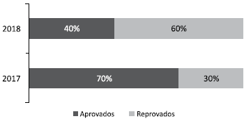 O gráfico apresenta informações sobre a distribuição do número total de candidatos aprovados e reprovados, que efetuaram concursos para o mesmo cargo, nos anos 2017 e 2018.