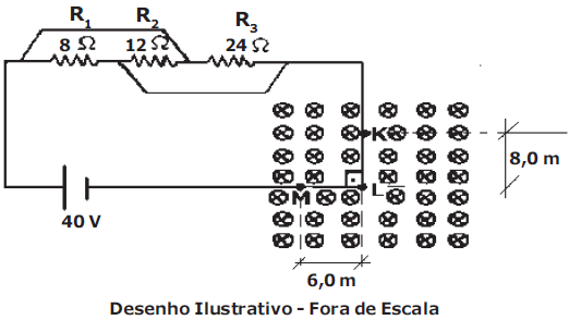 Um fio condutor no trecho KLM, sendo KL = 8,0 m e LM = 6,0 m, está dobrado em ângulo reto e está ortogonalmente inserido em um campo magnético uniforme de intensidade B = 0,40 T. Este fio está conectado a um circuito resistivo que é composto por um gerador ideal de ddp (diferença de potencial) E = 40 V e resistências ôhmicas de R1 = 8 Ω, R2 = 12 Ω e R3 = 24 Ω, conforme desenho abaixo. A intensidade da força resultante de origem magnética que atuará sobre o fio condutor no trecho KLM é: