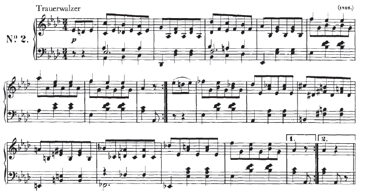 Observe a figura abaixo. Trata-se do Op. 09, D. 365, Nº 2 de Franz Schubert. A questão é baseada neste trecho.