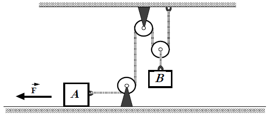 No sistema apresentado na figura abaixo, o fio e as polias são ideais, todos os atritos são desprezíveis e o módulo da força \overrightarrow{F} que atua sobre o bloco A vale 550 N. Considerando a aceleração da gravidade igual a 10 m/s2 e sabendo que as massas de A e de B valem 20 kg e 15 kg, respectivamente, a aceleração do bloco B, em m/s2, é igual a