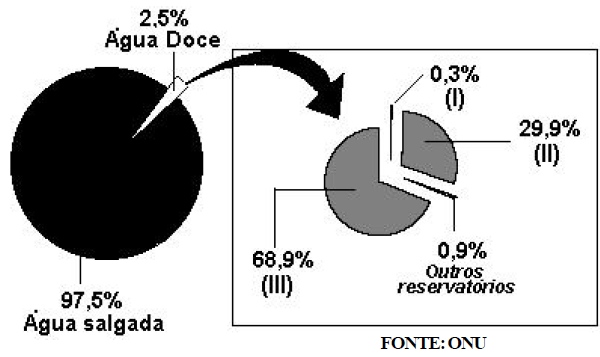 O gráfico abaixo apresenta a distribuição da água no nosso Planeta. Considerando a distribuição de água na Terra, pode-se dizer que os números I, II e III correspondem, respectivamente, aos seguintes reservatórios: