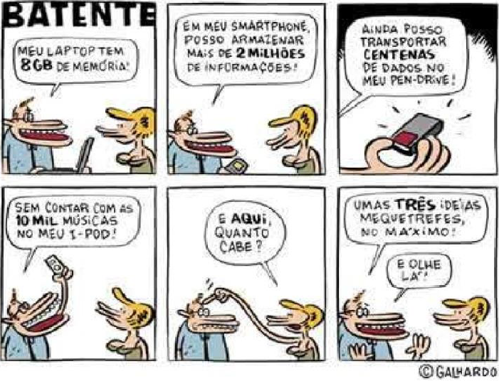 ( ) A fala do personagem, no quarto quadrinho, pode ser reescrita, sem prejuízo do sentido, da seguinte maneira: Quero gravar 10 mil músicas no meu i-pod.