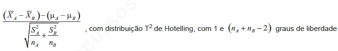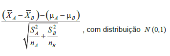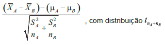 Um experimento foi conduzido para testar H_0:\mu_A=\mu_B contra a alternativa H_1:\mu_A \ne \mu_B, sendo \mu_A e \mu_B as médias de duas populações infinitas, independentes e normalmente distribuídas, isto é, X_A tem distribuição N(\mu_A, \sigma^2_A), X_B tem distribuição N(\mu_b, \sigma^2_B) e COV(X_A, X_B)=0. Amostras de tamanho n_A=n_B=5são extraídas das respectivas populações e as médias \overline{X}.=\frac{\sum X_i\cdot}{n.} e variâncias S.^2=\frac{\sum_i(X_{i.}-\overline{X}_.)^2}{n.-1}, calculadas para permitir a realização do teste. Considerando que as variâncias das populações sejam desconhecidas e iguais, a estatística do teste e sua distribuição de amostragem, respectivamente, são