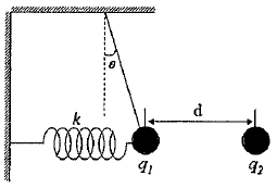 Na figura abaixo é apresenta uma carga q1 = q e massa m pendurada por um fio, inextensível e de massa desprezível, e presa a uma mola de constante elástica KM , ambos de material isolante.