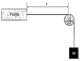 No esquema da figura abaixo, uma fonte coloca uma corda a vibrar, no modo fundamental, com uma frequência de 200 Hz. Considere que a corda seja inextensível e a polia ideal. Considere ainda que a massa do bloco nessa situação seja 4 kg e a distância I igual a 50 cm.