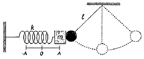 Sabendo que em t = 0 s os dois sistemas estão na posição de amplitude máxima de seus movimentos, como na figura, determine o tempo em segundos que eles levarão para se encontrarem novamente nessa mesma posição, e marque a opção correta. (Dados: k = 144 N/m ; m = 4 kg ; \ell= 10 cm; A= 5 cm; \pi= 3 ; g = 10 m/s2)