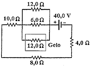 Propõe-se a realização de um experimento no qual um resistor de 12,0 \Omega está inserido dentro de um bloco de gelo a 0 ºC. O circuito montado está apresentado na figura abaixo.