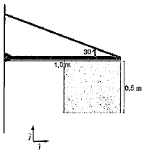 Uma barra homogênea de comprimento 1,0 m, cuja massa é 1,0 kg, está fixa por um pino. Essa barra sustenta uma placa homogênea e quadrada com 0,5 m de lado e massa 1,0 kg. O sistema é mantido em equilíbrio com a barra na horizontal tendo um fio de sustentação, inextensível e de massa desprezível, exercendo uma tensão sobre a barra, conforme apresentado na figura abaixo.