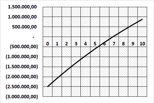 O valor presente líquido do projeto passa a ser positivo a partir do sexto ano, quando a soma dos valores futuros das entradas supera o valor do investimento a ser realizado. |