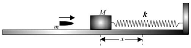 Um projétil, de massa m e velocidade v, colidiu frontalmente com um bloco de madeira de massa M que estava em repouso em uma superfície horizontal sem atrito, preso a uma mola ideal de constante elástica k. Após a colisão, o projétil e o bloco desenvolveram um movimento solidário, o que provocou, na mola, uma compressão máxima igual a x, conforme mostra a figura a seguir.