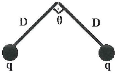 Duas esferas condutoras idênticas de carga q = 2,0 μ C estão penduradas em fios não condutores de comprimento D = 30,0 cm, conforme apresentado na figura abaixo. Se o ângulo entre os fios vale θ = 90°, qual é o valor das massas das esferas?