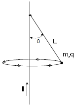 Uma pequena esfera de massa m = 2,0 ⋅ 10^{-6} \ kg e carga elétrica positiva q = + 0,30 coulombs gira, no sentido anti-horário (vista superior), ao redor de uma haste condutora vertical. A esfera e o pequeno anel em contato com a haste são interligados por um fio isolante e inextensível, de massa desprezível e comprimento L = 2 \sqrt 3 \ m (ver figura). O ângulo entre a haste e o fio é θ = 30º, e pela haste sobe uma corrente elétrica I = 100 amperes. A velocidade escalar da esfera, em m/s, é