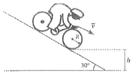 Devido à resistência do ar, após algum tempo descendo sem pedalar um longo plano inclinado de 30°, o ciclista da figura atingiu uma velocidade escalar máxima constante v, com as rodas de raio igual a 25,0cm girando, sem deslizar, com freqüência angular de 10rad/s. Nessa velocidade, considerando uma altura inicial h igual a 75,0m, a roda dianteira tocará o plano horizontal num intervalo de tempo, em segundos, igual a